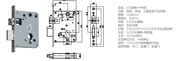 功能:雙快、雙活、上提反鎖” 下壓開鎖.