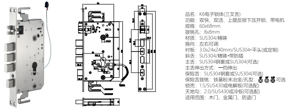 功能:雙快、雙活、上提反鎖下壓開鎖,帶電機