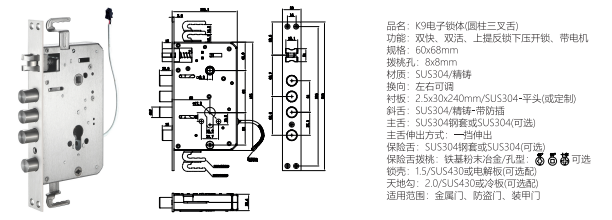 功能:雙快、雙活、上提反鎖下壓開鎖,帶電機